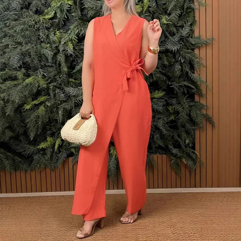 Sílvia/Informal Solid Color Jumpsuit with V-Neck and Bow for Women